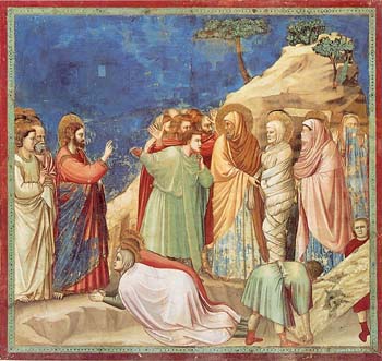 Obraz, który mamy przed oczyma pochodzi z kaplicy na Arenie w Padwie. Po 1300 roku zbudował ją Enrico Scrovegni na placu dawnej rzymskiej areny. W 1304 r. została ona konsekrowana i otrzymała tytuł: Maria Annunziata oraz Santa Maria della Carita. Giotto di Bondone (1267-1337) ozdobił tę kaplicę 38 freskami. W latach 1305-1306 powstały cykle obrazów opowiadające o życiu Joachima i Anny, oraz Maryi i Jezusa. Scena ze wskrzeszeniem Łazarza (J 11, 1-45) znajduje się na ścianie północnej. Warto wspomnieć, że inny fesk Giotta (ok. 1320), z tą samą sceną, zdobi kaplicę Marii Magdaleny w dolnej bazylice św. Franciszka w Aryżu. W obu wypadkach mistrz orientował się na wzorcach bizantyjskich.
